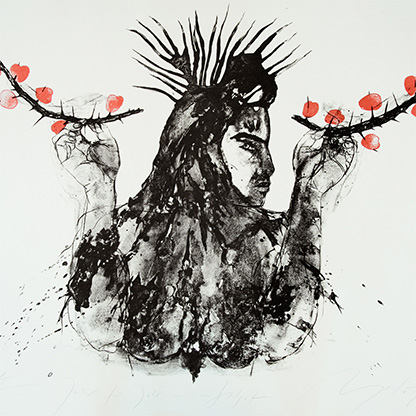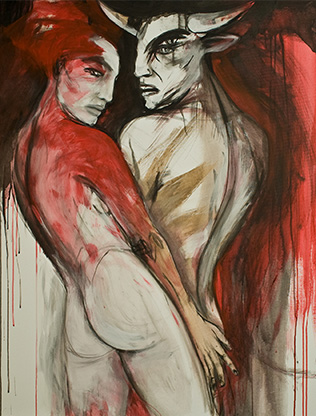 Die im allgemeinen Sprachgebrauch verfestigte Redewendung vom „roten Faden“ bezeichnet eine Richtlinie, einen kontinuierlichen Weg und erzeugt Assoziationen, welche in treffender Weise das Werk der Dresdener Künstlerin Angela Hampel charakterisieren. Seit 1982 arbeitet die Dresdenerin als freischaffende Künstlerin und fand schon in dieser frühen Zeit zu ihrem komplexen Thema der Darstellung von Paaren, von Varianten bzw. Spielarten der Partnerschaf. Ohne sich der Gefahr von inhaltsleeren Wiederholungen auszusetzen, überrascht die Künstlerin immer wieder in der Auslotung des Neben- und Miteinander von Menschen, Tieren und Pflanzen - erfundene Konstellationen als Resümee intensiver künstlerischer Selbstbefragung. Dieser „Grundsound“, vorgetragen in einer farbgewaltigen, expressiven Malerei oder in Grafiken mit meisterlichen Hell-Dunkel-Nuancen aufgezeigt, fand von Anfang an nationale und internationale Beachtung und wird seit Jahrzehnten in einer stringenten thematischen Kontinuität gepaart mit höchstem künstlerischem Anspruch weiter ausgedeutet.