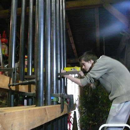 Ausgerüstet mit Modellen für die Plastik, besten Vorsätzen und viel Elan reisten die Projektteilnehmer im Januar 2015 für eine Woche nach Oranienburg, um in der Werkstatt Olaf Hannemanns das Erdachte und Entworfene in das ungewohnte und schwer zu bearbeitende Material Eisen umzusetzen. So wurde geschmiedet, gefräst, geschweißt und mit tatkräftiger Hilfe der beiden Künstler sowie der begleitenden Kunst- Fachlehrerinnen verwandelten sich die Modellminiaturen in eine 500 Kilogramm schwere Installation aus Stahlrohren bzw. –bändern.