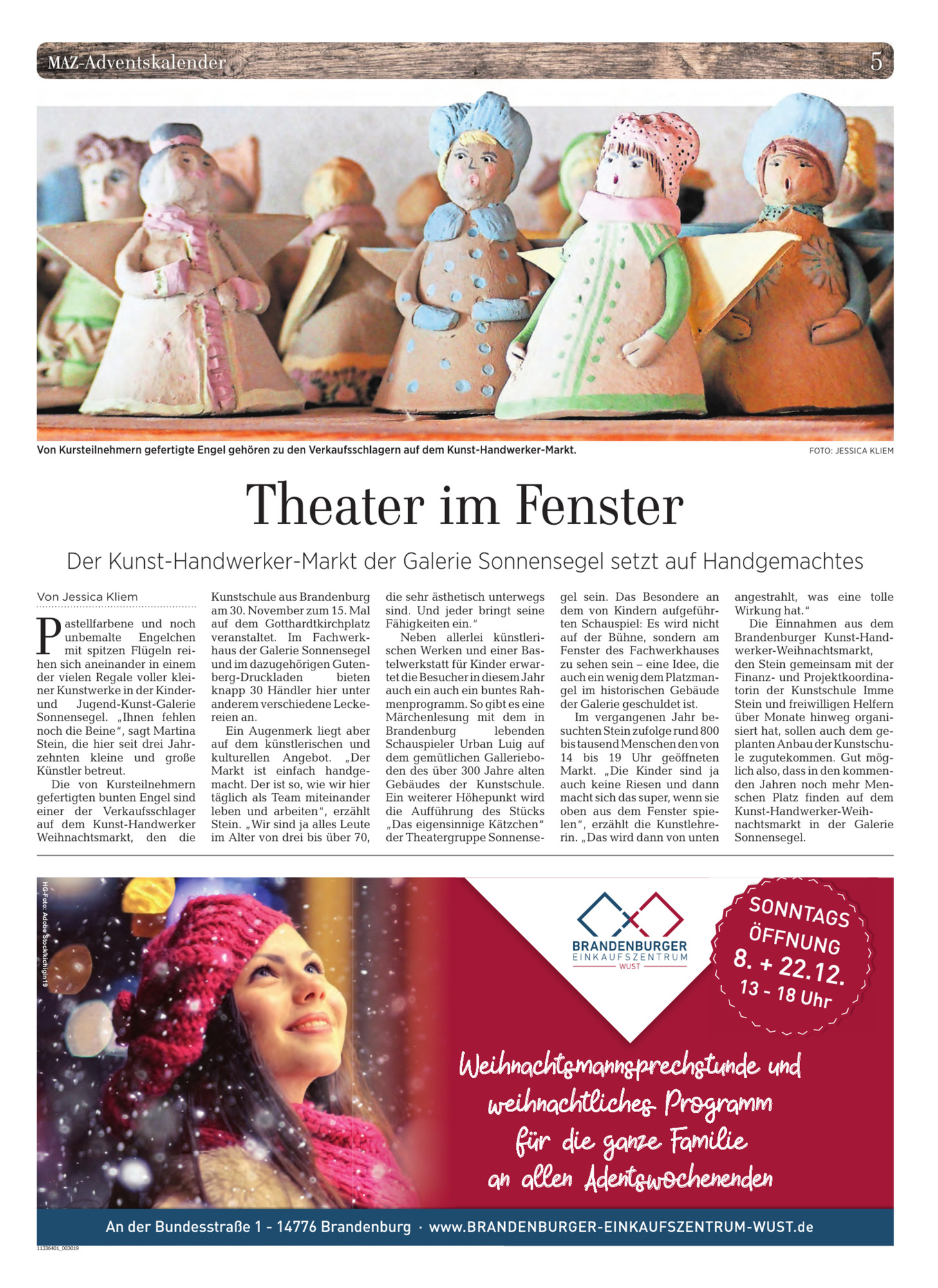 Zum fünfzehnten Mal fand der kleine aber feine Weihnachtsmarkt der Galerie „Sonnensegel“ statt. Er hat sich mittlerweile als fester und beliebter Bestandteil des Weihnachtsprogramms in der Stadt etabliert. Auch in diesem Jahr setzte der veranstaltende Trägerverein auf Bewährtes und Neues. Viele der teilnehmenden Händler und Helfer sind dem Brandenburger Publikum schon seit Jahren bekannt.