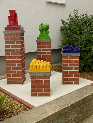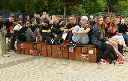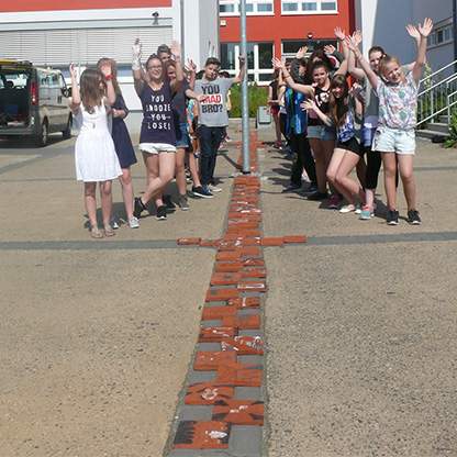 Nach der umfassenden Sanierung ihres Schulgebäudes freuten sich die Schüler der Oberschule Nord zwar über die verbesserten Lernbedingungen, empfanden aber das Schulumfeld als etwas zu trist, zu wenig einladend. Deshalb wurde der Kontakt zum langjährigen Kooperationspartner, der Galerie „Sonnensegel“ aufgenommen. Der Wunsch nach einem unverwechselbaren Erkennungszeichen ihrer Schule bzw. nach einer schülerfreundlicheren Umgestaltung des Schulhofes mündete in ein mehrjähriges Projekt. Zuerst wurde eine markante Fassadengestaltung in Angriff genommen, die eine überzeugende Fernwirkung ausstrahlen sollte. Deshalb sollte eine monotone Sichtbetonwand des Schulgebäudes mit einem großflächigen plastischen Relief aufgewertet werden. Mit großem Eifer ging eine Schülergruppe unter der Leitung des Bildhauers Dietmar Block an die Entwurfsarbeiten. Skizzen und plastische Vorarbeiten entstanden, die in ihrem abstrakten Formenspielüberzeugten. Doch nicht alle Blütenträume reiften – aus Kostengründen musste die plastische Variante verworfen werden. Als Kompromiss wurde ein Reliefentwurf als riesiges, farbiges Graffiti auf die Wand gesprüht. Von diesem Zwischenerfolg motiviert, erstellten Schüler in den folgenden Schuljahren Keramikfliesen zur Pflasterung des Schulhofes bzw. zur Aufbereitung von Sitzgelegenheiten. Auch vier große „Kapitelle“ für gemauerte Stelen entstanden, welche als Solitär auf dem Schulgelände zusammengestellt, die vier Elemente verbildlichen. Die Dauer des Langzeitprojektes machte es möglich, dass Schüler, welche als Siebenklässler beim Start des Vorhabens dabei waren, zum Ende Ihrer Schullaufbahn in der 10. Klasse den Abschluss der Umgestaltung miterleben konnten.