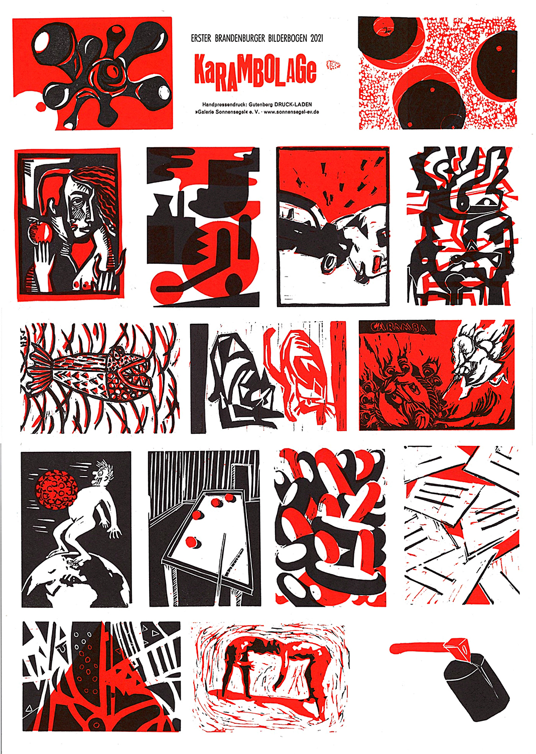 Anlässlich des Tages der Druckkunst 2021, am 15.März, haben die Kursleiter der Kunstschule befreundete Künstler eingeladen den „ERSTEN BRANDENBURGER BILDERBOGEN“ mitzugestalten. Sechzehn mehrfarbige Originalgrafiken in Postkartenformat, welche den Begriff „Karambolage“ illustrieren, werden im Gutenberg- DRUCKLADEN am genannten Tag zu einem Bilderbogen vereint. Die ersten Probedrucke lassen schon das breite Spektrum der Wortdeutung erahnen: da stoßen abstrakte auf realistische Formen, „karambolieren“ Männer, Frauen, Katzen, Fische und ja, auch das Corona-Virus wird druckgrafisch kommentiert.