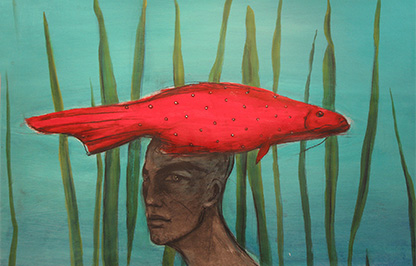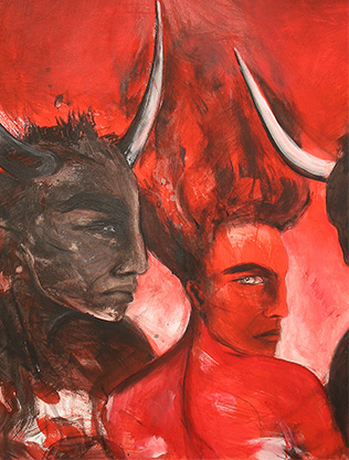 Die Auseinandersetzung mit Frauengestalten, seien es historisch belegbare oder fiktive Figuren, bestimmt auch die Auswahl der in der Ausstellung gezeigten Arbeiten. Angela Hampel zeigt ihre Protagonistinnen expressiv eindrucksvoll, mit einer geheimnisvollen Aura umgeben. Selbstbewusst agieren ihre Gestalten allein oder in Paarbeziehungen und fesseln den Rezipienten mit fragendem Blick. All diese Darstellungen können als Ausdruck einer tiefen Sehnsucht nach Harmonie zwischen Mensch und Natur und insbesondere zwischen den Geschlechtern gelesen werden.