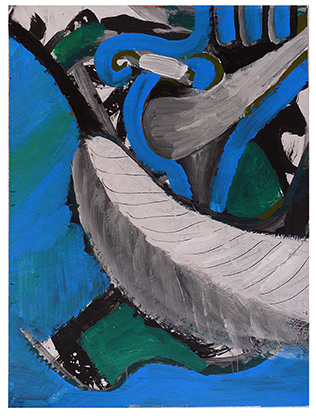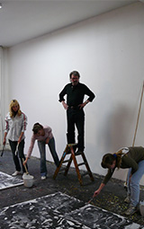Ausgerüstet mit Malutensilien, die den Abiturienten im Schulalltag noch nicht in die Finger geraten waren, begann der malerische Exkurs. Zu ebener Erde wurden zu einem Mosaik ausgelegte Einzelformate in Gruppenarbeit mit Strukturen in Schwarz und Weiß gefüllt. Pinsel, die mit meterlangen Bambusstangen verlängert waren, erlaubten den Akteuren auch in das Malareal der Nachbarn hinein zu arbeiten, so dass sich in dieser ersten Arbeitsphase ein ständiger Wechsel der Entstehung und Zerstörung malerischer Zeichen ergab. Danach suchten sich die Schüler bis zu drei der auf Keilrahmen gespannten Papiere zur individuellen Weiterbearbeitung aus. Nunmehr in die Vertikale der Staffelei gebracht, mussten die Teilnehmer in den scheinbar zufällig entstandenen Malergebnissen, Anregungen für "ihr" Bild finden.