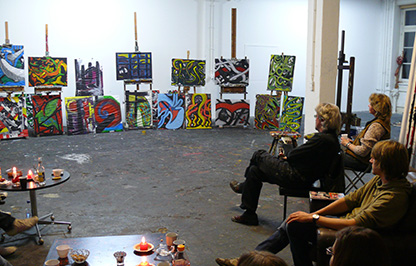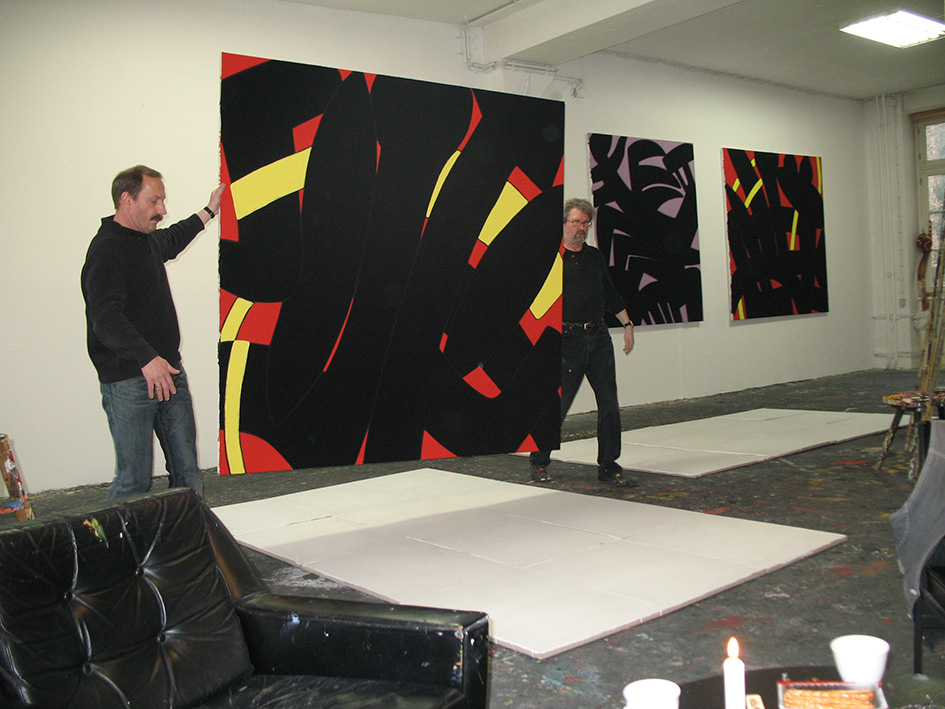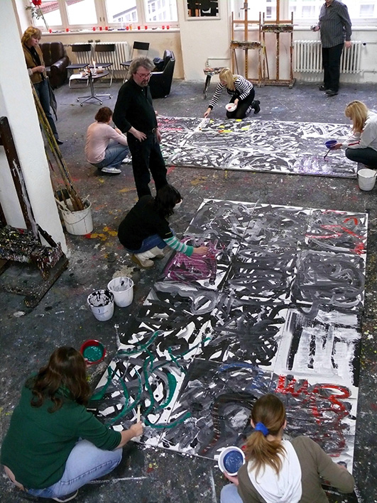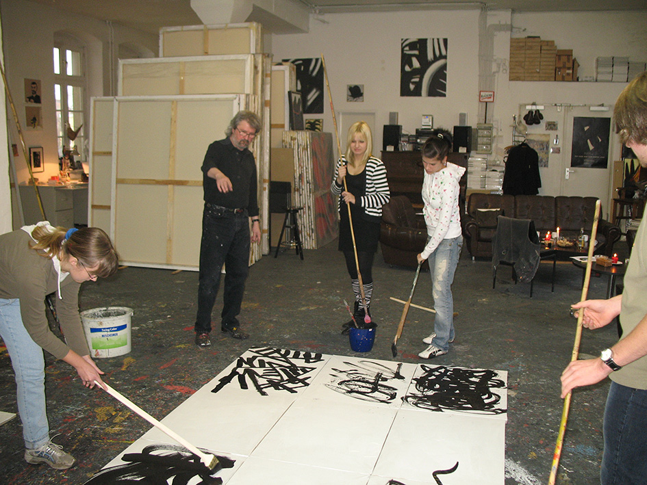 Gelingt es mit den Mitteln des „action paintings“ eine eigene Formensprache zu entwickeln mit der bestimmte Inhalte formuliert werden können? Dieser Frage gingen Schüler zweier Brandenburger Gymnasien bei einem Workshop im Berliner Atelier des Malers Hans- Hendrik Grimmling nach. Wirkten die an den Wänden hängenden großformatigen abstrakten Arbeiten des Künstlers anfänglich noch eher einschüchternd auf die Maleleven, fand Hans- Hendrik Grimmling durch unkonventionelle Mittel doch sehr schnell Wege, die anfängliche Befangenheit in schöpferische Kreativität umzuwandeln.
