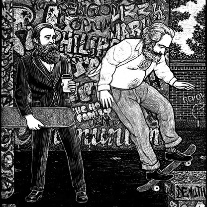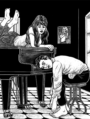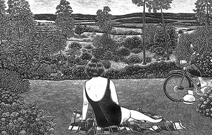 Wenn von „der gefährlichsten Art zu zeichnen“ die Rede ist, denkt man natürlich an… Schabkarton. Dieses besondere grafische Material, eine mit Porzellanerde überzogene Pappe, welche abschließend mit schwarzer Farbe versiegelt wird, ist der bevorzugte Bildträger der Illustratorin Line Hoven. Mit einem gewöhnlichen Cutter kratzt die Künstlerin auf der glatten, dunklen Oberfläche des Schabkartons zarte Linien heraus, welche sich in feinsten Schraffuren bzw. Strukturen bündeln und sich durch die Freilegung des kreidigen Zwischengrundes klar von der samtig schwarzen Oberschicht abheben. Das eingangs genannte, augenzwinkernde Diktum von der Gefährlichkeit der Methode kann vordergründig auf den Umgang mit dem scharfen Kratz-Werkzeug bezogen werden, meint aber eher, dass die Technik wenig Fehler verzeiht. Korrekturen, das Überschwärzen nicht gelungener Bilddetails ist nur partiell möglich. Derartiges Nacharbeiten hat Line Hoven allerdings nur selten nötig. Schon in ihrer Studienzeit hat sie die „Kratztechnik“ für sich entdeckt und eine ausdrucksstarke, wiedererkennbarBildsprache gefunden. Kommt man auf die Illustrationsarbeit der Grafikerin Line Hoven zu sprechen, muss unbedingt die langjährige Zusammenarbeit mit dem Schriftsteller Jochen Schmidt erwähnt werden. Der in Ostberlin geborene Autor war auf die Arbeiten Line Hovens aufmerksam geworden und konnte sie als Illustratorin für das Projekt „Dudenbrooks - Geschichten aus dem Wörterbuch“ gewinnen. Weil die Chemie zwischen der Bildkünstlerin und dem Literaten stimmte, Line Hoven und Jochen Schmidt bis heute in den Arbeiten ihres jeweiligen künstlerischen Gegenübers Inspiration für fortlaufende Bild- und Textideen finden, hat sich die Liste der gemeinsamen Buchprojekte seit 2006 ständig verlängert.